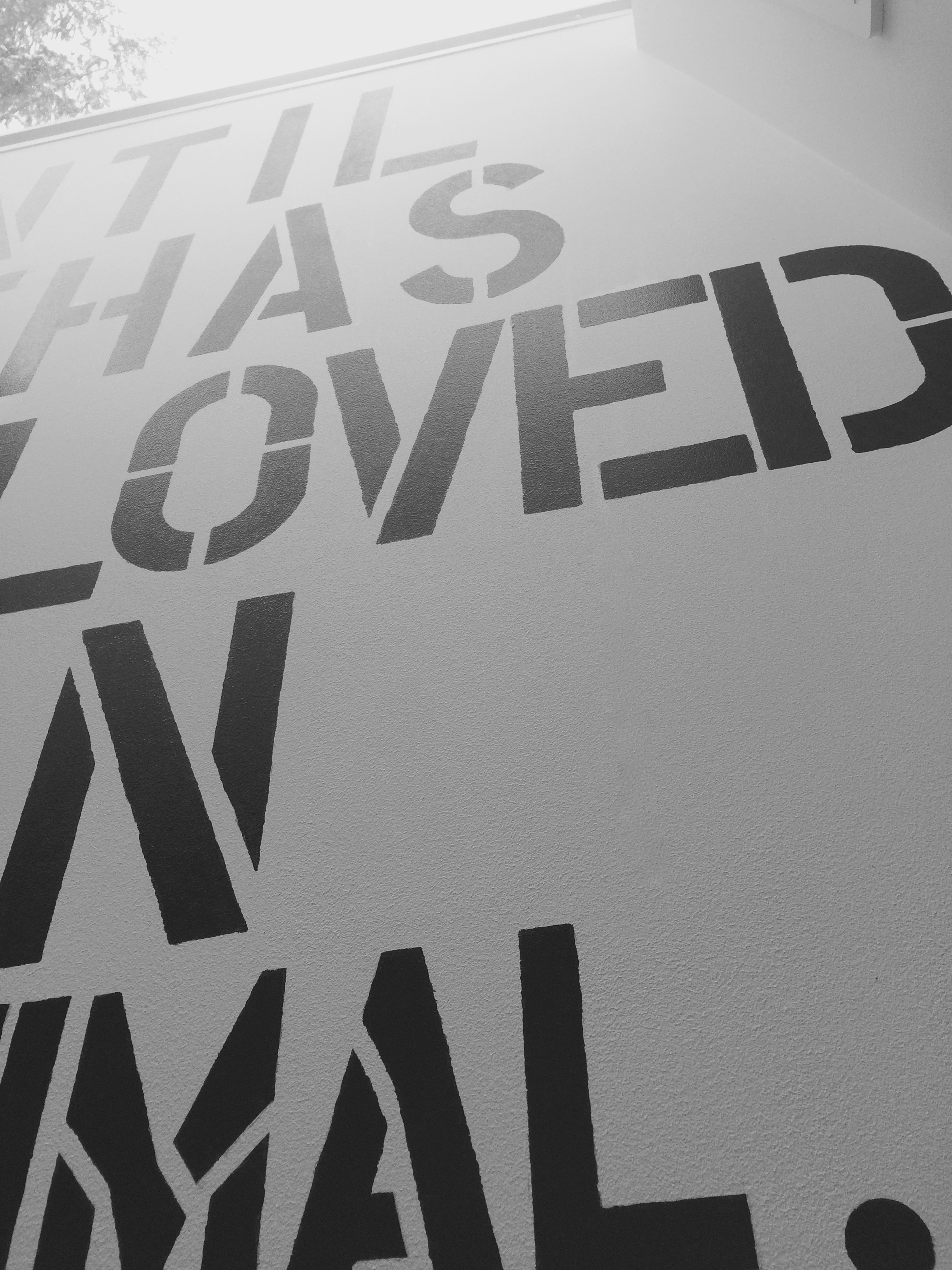 Well, I’m sure you have been somewhere, and glanced at that bathroom stall, or bus stop, or side of a building and have read what was written? I think many of us do, as we are curious beings. When I decorate, I often think of the people that will be using the space, or visiting, and I take this opportunity to put something meaningful and thought provoking into it. Now I know people have been putting stencils on the walls for years, and in reality I have never been too much of a fan. I am drawn to very modern spaces, with minimal décor, but I love to add a punch of something, either with colour, pattern, or just something almost inappropriate for the space. So in a spare bathroom for guests I have chosen to use massive stencils in a high gloss paint to go up the entire wall. So yes, I am not a fan of small stencils most of the time, but I do go HUGE for impact! Of course it would not be complete without spreading the love affair of animals I have, and constantly evoking change. This quote made the entire bathroom.